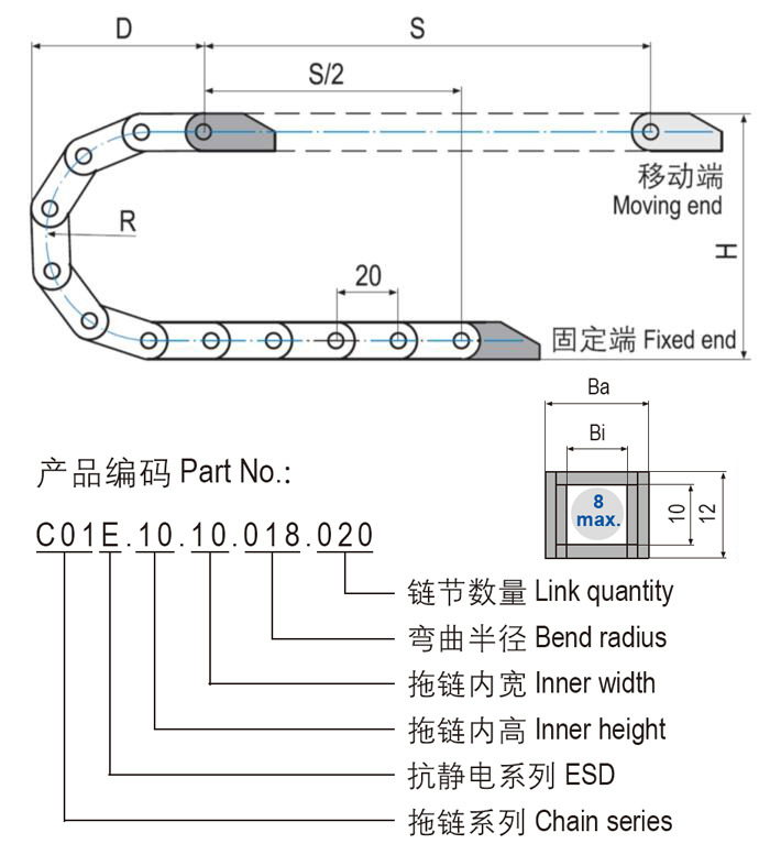 C01E.10抗靜電微型塑料拖鏈體積極小,基于一片式設(shè)計重量輕特別適用于高速運動。C01E.10抗靜電微型塑料拖鏈適用于較小安裝空間,多種尺寸規(guī)格可選。