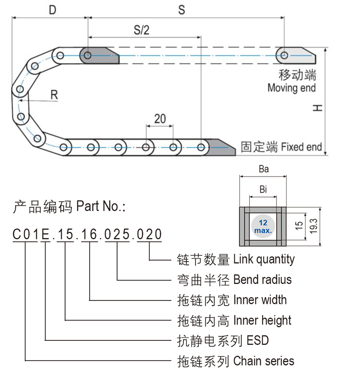 C01E.15抗靜電微型塑料拖鏈體積極小,基于一片式設(shè)計重量輕特別適用于高速運動。C01E.15抗靜電微型塑料拖鏈適用于較小安裝空間,多種尺寸規(guī)格可選。