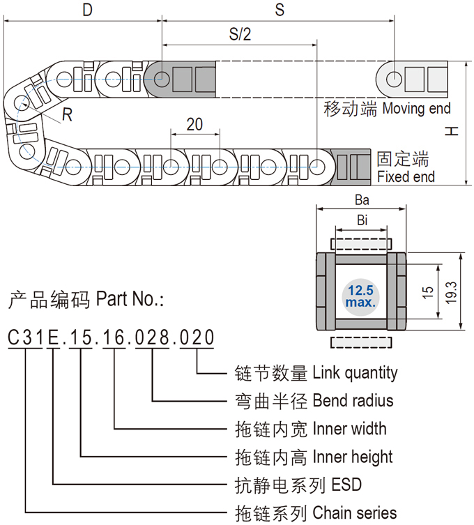 C31E.15抗靜電微型電纜拖鏈可沿內(nèi)側(cè)或外側(cè)打開,堅(jiān)固耐用和多種打開方式設(shè)計(jì),適用于高速運(yùn)動(dòng)。C31E.15抗靜電微型可打開電纜拖鏈適用于較小安裝空間,多種內(nèi)寬規(guī)格可選。