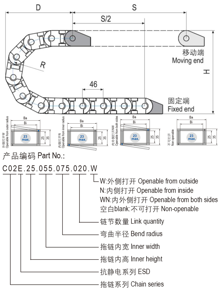 C02E.25抗靜電通用型塑料拖鏈?zhǔn)菓?yīng)用范圍廣泛的產(chǎn)品,簡單而多功能的組裝結(jié)合堅固性,高強度配合更安靜的運動,更長的電纜壽命和許多安裝選項
