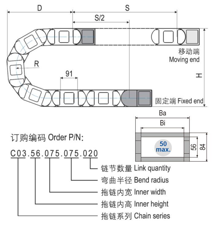 C03.56重載型塑料拖鏈結(jié)合了電纜拖鏈之前所有的優(yōu)點,是所有DURAMOV?塑料拖鏈中最好的。在與其它系列塑料拖鏈具有相同或更小尺寸的情況下,具有更好的穩(wěn)固性。使用C03.56重載電纜拖鏈成本更低,壽命更長