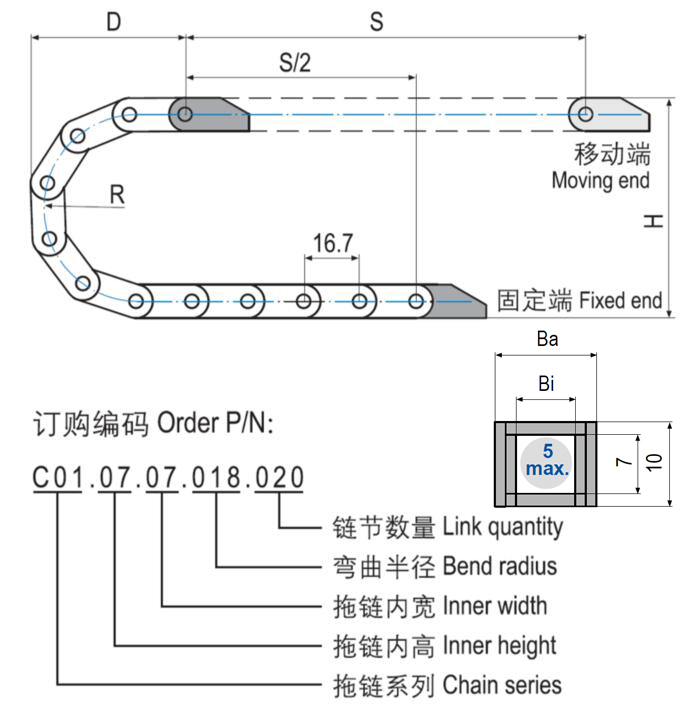 C01.07微型塑料拖鏈體積極小,基于一片式設(shè)計重量輕特別適用于高速運動。C01.07微型塑料拖鏈適用于較小安裝空間,多種尺寸規(guī)格可選。
