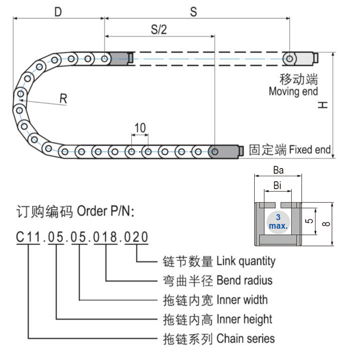 C11.05易填充微型塑料拖鏈體積極小,基于一片式開口設(shè)計(jì)重量輕且便于快速填充電纜,同樣適用于高速運(yùn)動(dòng)。C11.05微型塑料拖鏈適用于較小安裝空間,多種尺寸規(guī)格可選