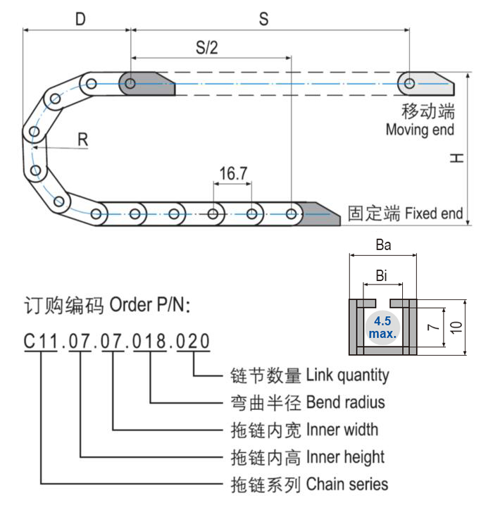 C11.07微型塑料拖鏈體積極小,基于一片式設(shè)計(jì)重量輕特別適用于高速運(yùn)動(dòng)。C11.07微型塑料拖鏈適用于較小安裝空間,多種尺寸規(guī)格可選。