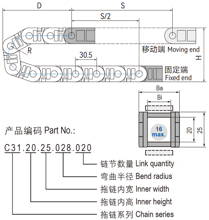 C31.20微型電纜拖鏈可沿內(nèi)側(cè)或外側(cè)打開,堅固耐用和多種打開方式設(shè)計,適用于高速運動。C31.20微型可打開電纜拖鏈適用于較小安裝空間,多種內(nèi)寬規(guī)格可選。