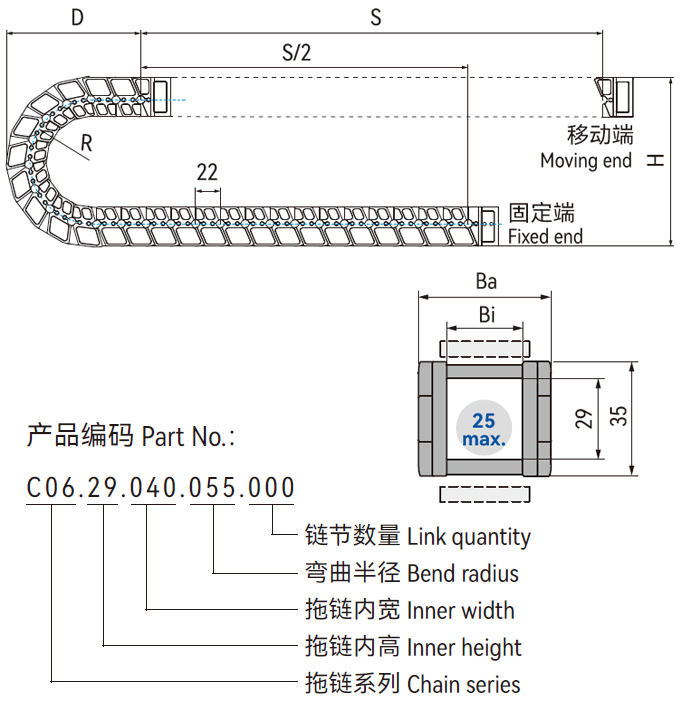 C06.29輕音型電纜拖鏈采用特殊結(jié)構(gòu)設(shè)計(jì),使用壽命長(zhǎng);由于拖鏈采用圓弧外形設(shè)計(jì)以及短節(jié)距鏈節(jié)采用彈性元件連接降低了拖鏈彎轉(zhuǎn)過(guò)程中的振動(dòng),適合低噪音、高速與無(wú)塵室應(yīng)用。