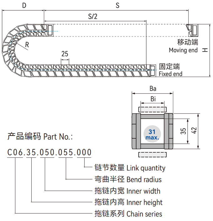C06.35輕音型電纜拖鏈采用特殊結(jié)構(gòu)設(shè)計(jì),使用壽命長;由于拖鏈采用圓弧外形設(shè)計(jì)以及短節(jié)距鏈節(jié)采用彈性元件連接降低了拖鏈彎轉(zhuǎn)過程中的振動(dòng),適合低噪音、高速與無塵室應(yīng)用。